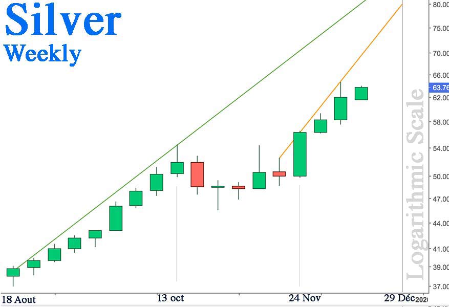 Parce que si l’on observe le graphique hebdomadaire de l’argent en échelle logarithmique, la résistance semble pointer au-dessus de 80 $ au début de 2026, puis au-dessus de 85 $ à la mi-février :