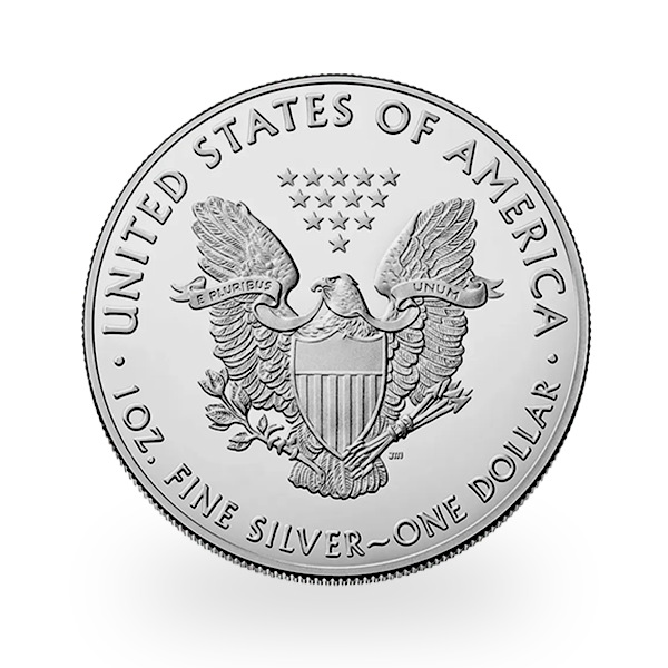 Le revers arbore le pygargue à tête blanche (l'emblème national des Etats-Unis) avec un bouclier, tenant dans une serre un rameau d’olivier et, dans l’autre, des flèches, sous lesquelles sont inscrites les initiales du graveur John Mercanti. Les mots E PLURIBUS UNUM ("Un seul à partir de plusieurs") figurent dans un ruban au-dessus de ses ailes déployées. Un triangle inversé d’étoiles apparaît au-dessus de sa tête avec, sur les contours, les inscriptions UNITED STATES OF AMERICA et 1 OZ FINE SILVER – ONE DOLLAR.
