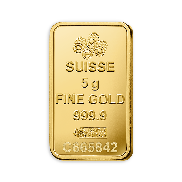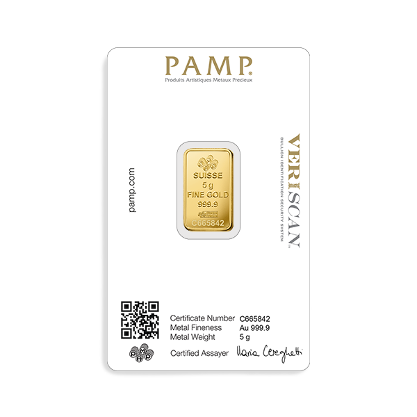 Sur l’avers, figurent le logo PAMP, l’inscription “Suisse”, le poids “5 g”, la mention “Fine Gold”, la pureté “999.9”, la marque de l’essayeur l’essayeur, ainsi qu’un numéro de série unique assurant l’authenticité et la traçabilité de chaque lingot.