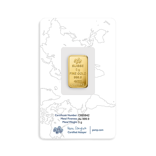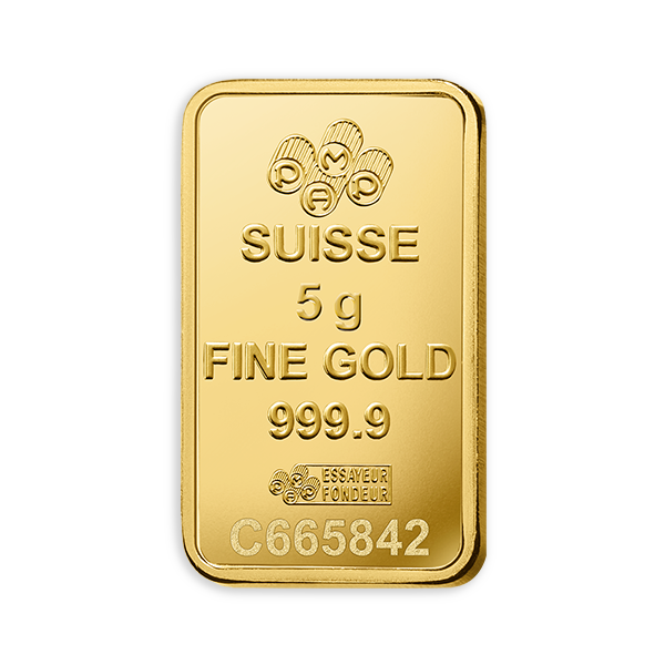 Le revers présente le logo PAMP, l’inscription “Suisse”, le poids “5 g”, le métal “Fine Gold”, la pureté “999.9”, le tampon officiel de l’essayeur, ainsi qu’un numéro de série unique garantissant l’authenticité et la traçabilité du lingot.