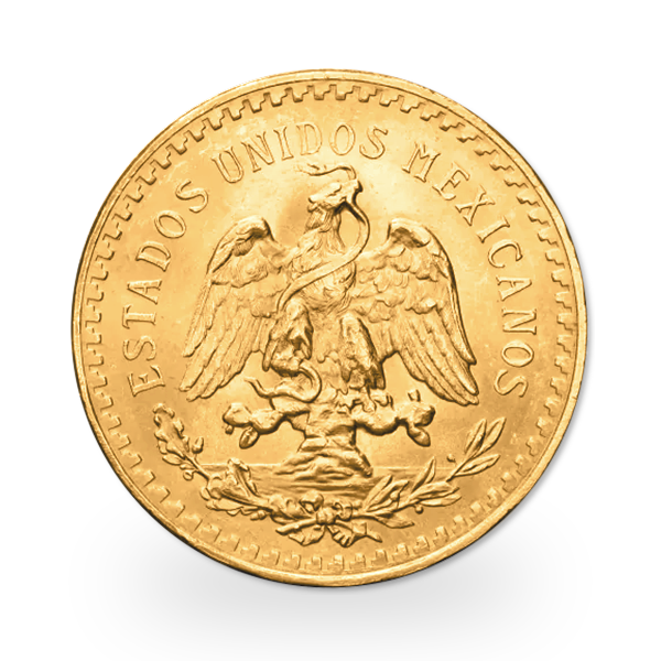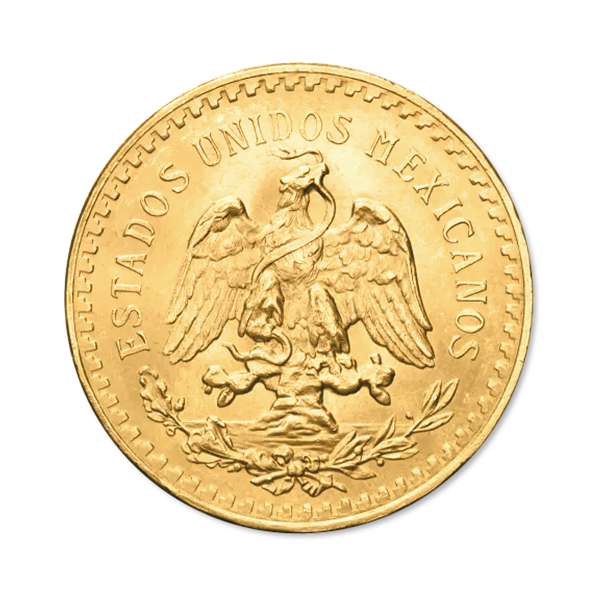 Le revers arbore une représentation classique de l’aigle royal mexicain tenant un serpent dans son bec et ses serres, entouré de l’inscription “ESTADOS UNIDOS MEXICANOS (“États-Unis mexicains”). Fait intéressant, les pièces d’or de 50 Pesos, 10 Pesos et 5 Pesos montrent un aigle tourné vers l’avant, une version ancienne des armoiries, inspirée du style français de la fin du XIXᵉ siècle.