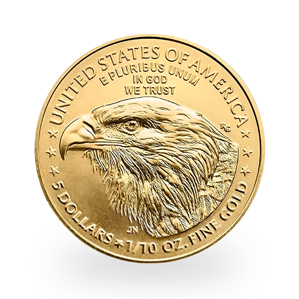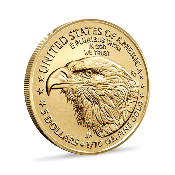 Au revers, la pièce présente un Pygargue à tête blanche, emblème national des États-Unis. Autour du motif figurent les inscriptions "UNITED STATES OF AMERICA", "E PLURIBUS UNUM" ("Un seul à partir de plusieurs"), "IN GOD WE TRUST" ("En Dieu nous croyons"), ainsi que la valeur faciale "5 DOLLARS" et la mention "1/10 OZ. FINE GOLD".