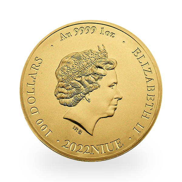 Le revers représente Sa Majesté la reine Elizabeth II, célébrant ses 70 années de règne. Il s’agit du quatrième portrait officiel de la souveraine, créé en 1998 par le sculpteur Ian Rank-Broadley. La gravure montre une reine mature portant les boucles d’oreilles boutons en perles de la reine Mary et le diadème des Girls of Great Britain and Ireland. Comme à l’habitude, la valeur faciale (100 dollars de Niue) et la pureté de l’or (.9999) figurent également sur cette face.