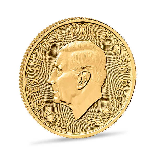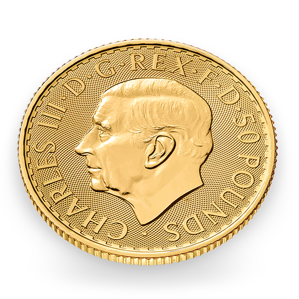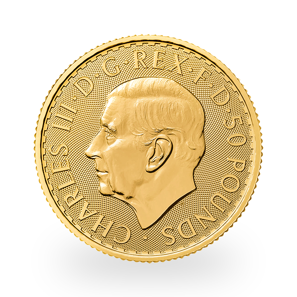 L’avers présente le portrait solennel de Sa Majesté le Roi Charles III tourné vers la gauche, entouré des inscriptions “50 POUNDS”, “CHARLES III” et “D.G. REX. F.D.” — abréviation latine de “Dei Gratia Rex Fidei Defensor” (“Par la grâce de Dieu, Roi, Défenseur de la Foi”).