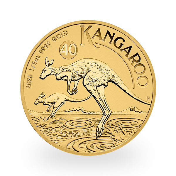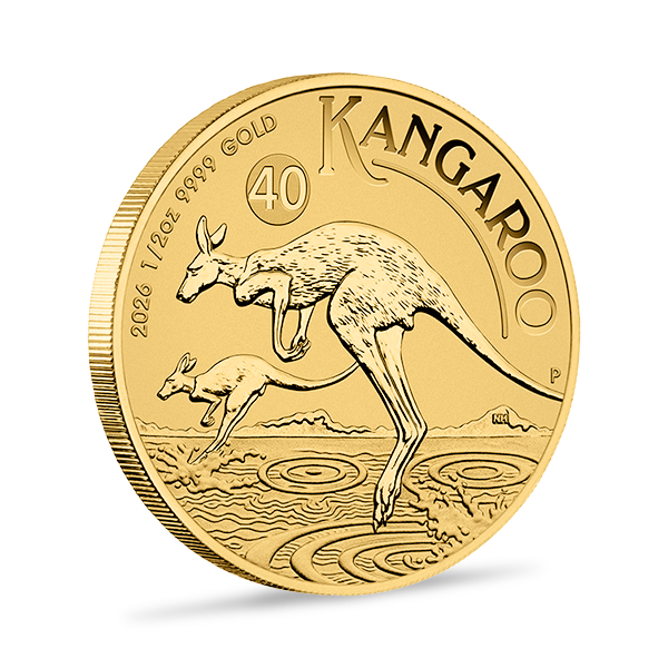 Le revers de la pièce 2026 met en scène deux kangourous bondissant au-dessus de l'eau, sur fond de paysage montagneux. Le chiffre “40” rend hommage au 40e anniversaire de l'Australian Nugget, la première série officielle de pièces d'or ayant eu cours légal en Australie. Le motif comprend l'inscription “KANGAROO”, l'année de frappe ”2026“, la marque d'atelier ”P“, ainsi que le poids ”1/2 oz“, la pureté ”9999“ et le nom du métal ”GOLD“.